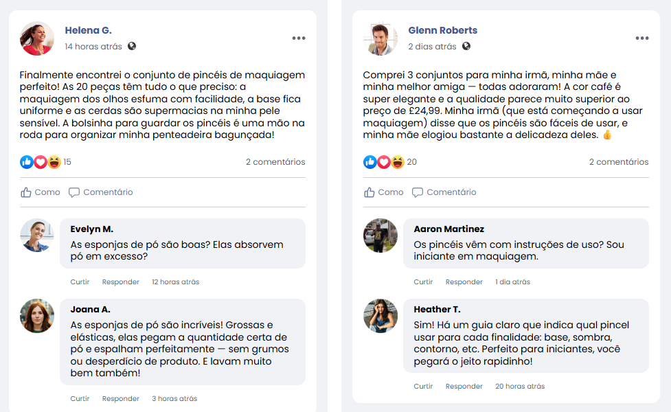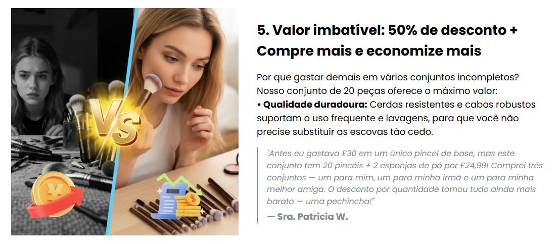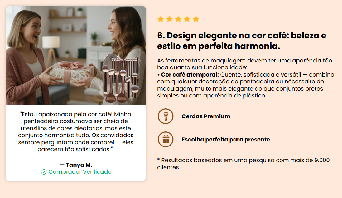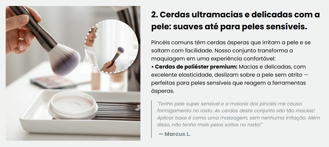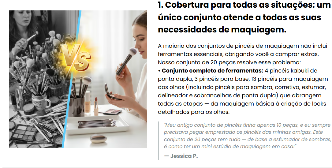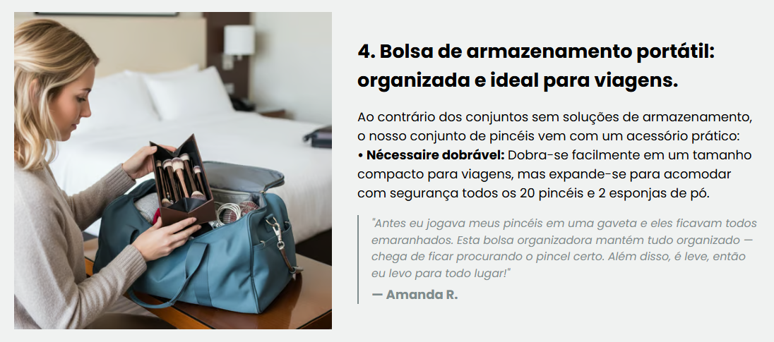 "Viajo muito a trabalho, e este conjunto é uma mão na roda. Os pincéis de ponta dupla me permitem levar apenas um conjunto em vez de um monte de ferramentas. Consigo fazer uma maquiagem completa, da base à maquiagem dos olhos, em 10 minutos — é muito prático!"